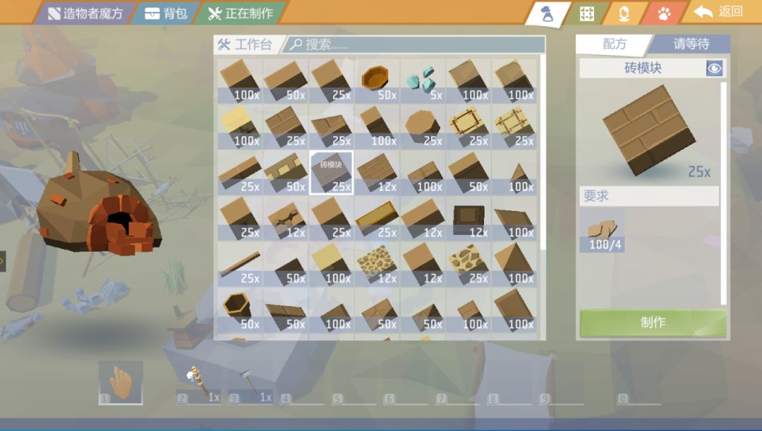 收集足够多的粘土之后,找到“炭窑”工作台,选择一个你中意的砖模块,点击制作即可。值得注意的是,不同类型、外观的砖模块所需的粘土数量也不一样。根据实际情况,酌情制作。