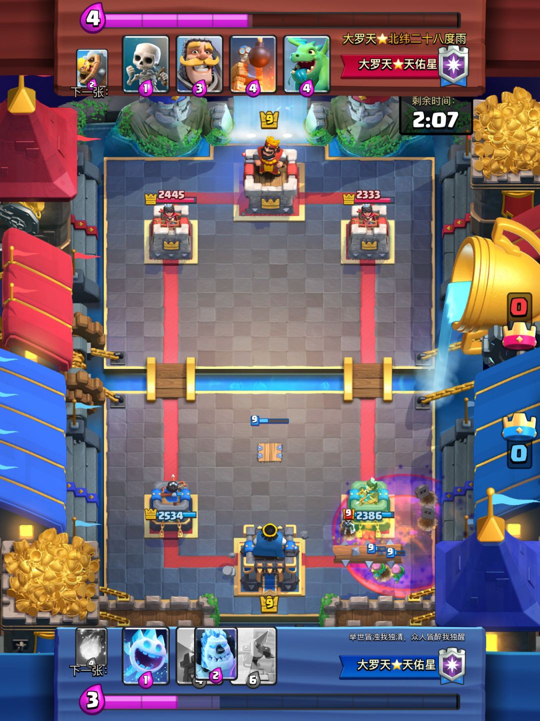 本期来讲讲速弩如何打墓园。速弩打墓园总的来说是优势对局,常见的墓园一般是龙骑冰法墓,弩立下来没有很好的部队挡弩,但玩的好的墓园有时候会抓住一波机会直接带走速弩打墓园得要预判,比如对面桥头骑士或龙宝,就有大概率要直接蹦迪,我们可以冰人挡住,别让骑士或龙宝进入公主塔攻击范围,再下弓箭手配合公主塔解墓园,基本上墓园一下都摸不到,再用电塔解过来的龙宝或者骑士。如果读出对面是墓园卡组,可以直接标准位立进攻弩,并下一个冰激凌在连弩前面,如果对面直接桥头炸弹塔炸连弩或者桥头骑士砍连弩,那趁他被冻住感觉顶上冰人保弩,电塔后位护弩,建议不要用电塔抗龙宝的伤,不然电塔没了连弩就任对面宰割了,稍微卖下弩血,被龙宝喷两口无伤大雅,电塔解龙宝的速度也是一流的。在防守墓园时,弓箭手作用就很大了,冰人挡住前排部队,弓箭手吃墓园,对面肯定会扔毒毒弓箭手,但弓箭手不会立即死亡,还能持续一段时间,弓箭手死了再补个滚木清走剩余骷髅。因为墓园如果看到弓箭手再毒,往往会让弓箭手活很久,吃掉很多小骷髅,所以墓园有时会预判毒药,这时弓的位置就很重要,推荐下左下角,或者国王塔前靠右一格,这样对面预判的毒药可能毒空,亏很多费。防完这波我们肯定是赚费方,立马立弩进攻,对面是很难挡下来的。以上是应对龙骑墓的方法,而最近新版墓园卡组融入了被增强的野蛮人小屋,一般对面都会开局中置小屋,我们就用连弩吃掉这个小屋,打这套墓园不能随便进攻,不然对面用房子挡死连弩之后还会留下一堆烦人的野蛮人配合墓园进攻,我们就很头疼,所以我们要做的就是不停的立防守弩,如果对面小屋中置,就防守弩吃掉,然后过出第二个弩进攻,对面肯定会转为沉底房子,我们就直接换路进攻弩,对面手上只有三费根本挡不住。总的来说,弩对中初级墓园,弩优势。但是遇见墓园高手,瞬间弩优势变劣势,我专门和七千墓园大佬来了几把,三负一胜,赢的那局还是对面失误了,墓园高手打弩和墓园普通玩家有不同的方法,令弩头疼,弩也要用不同的方法打,具体内容下期再