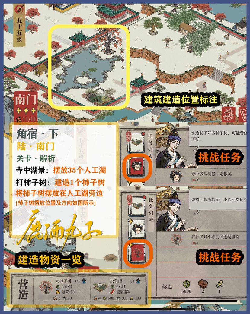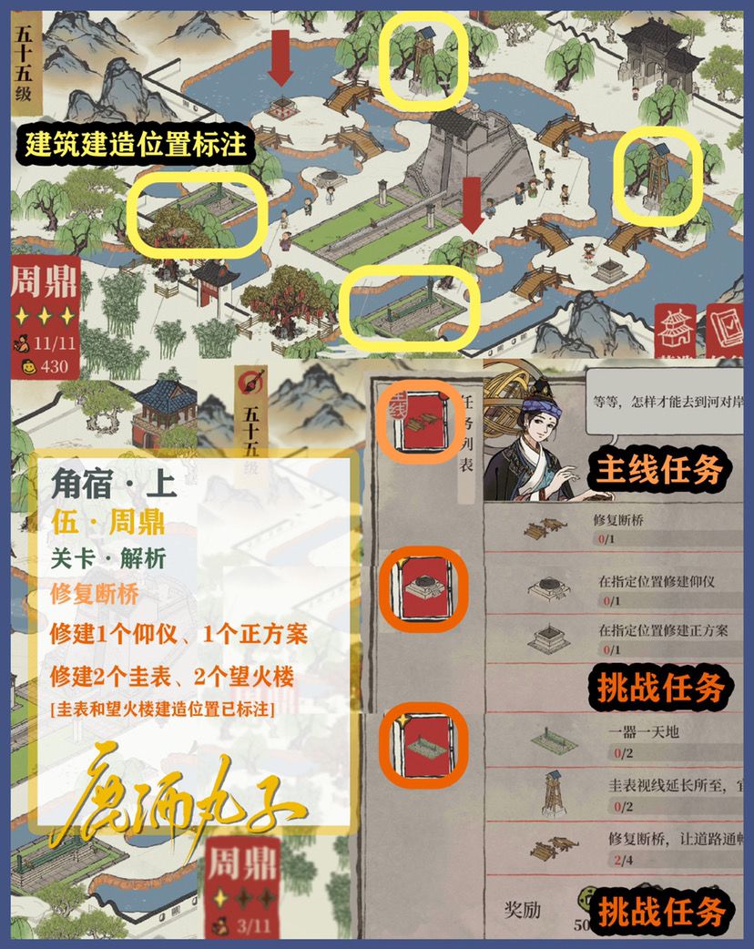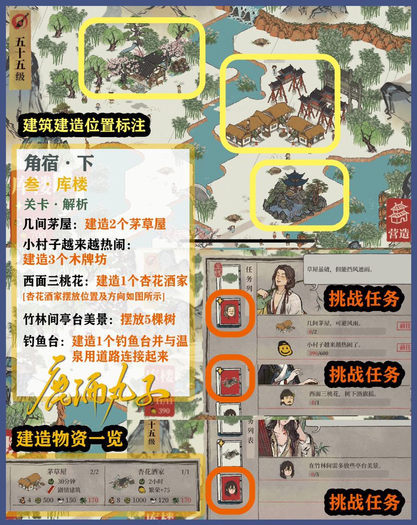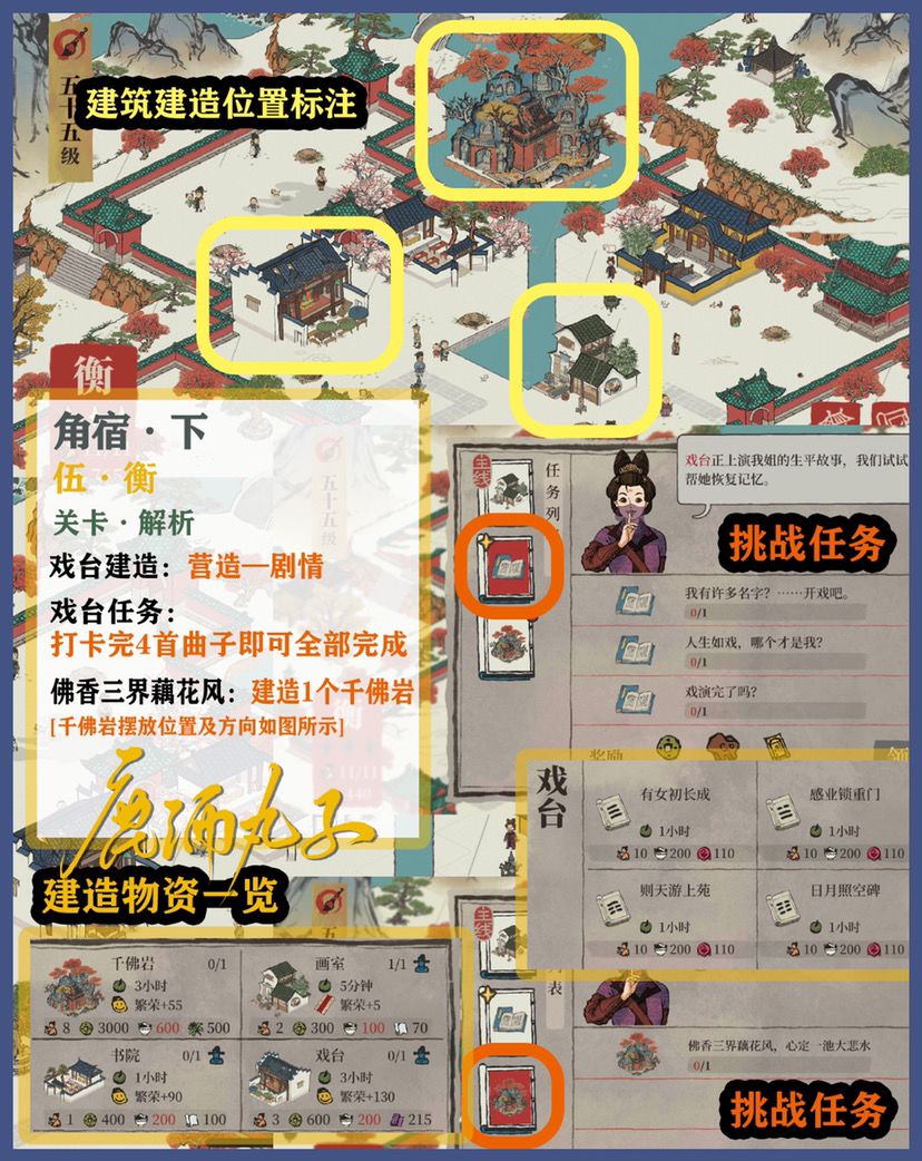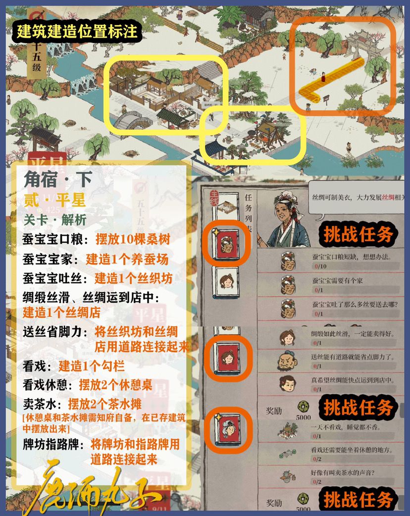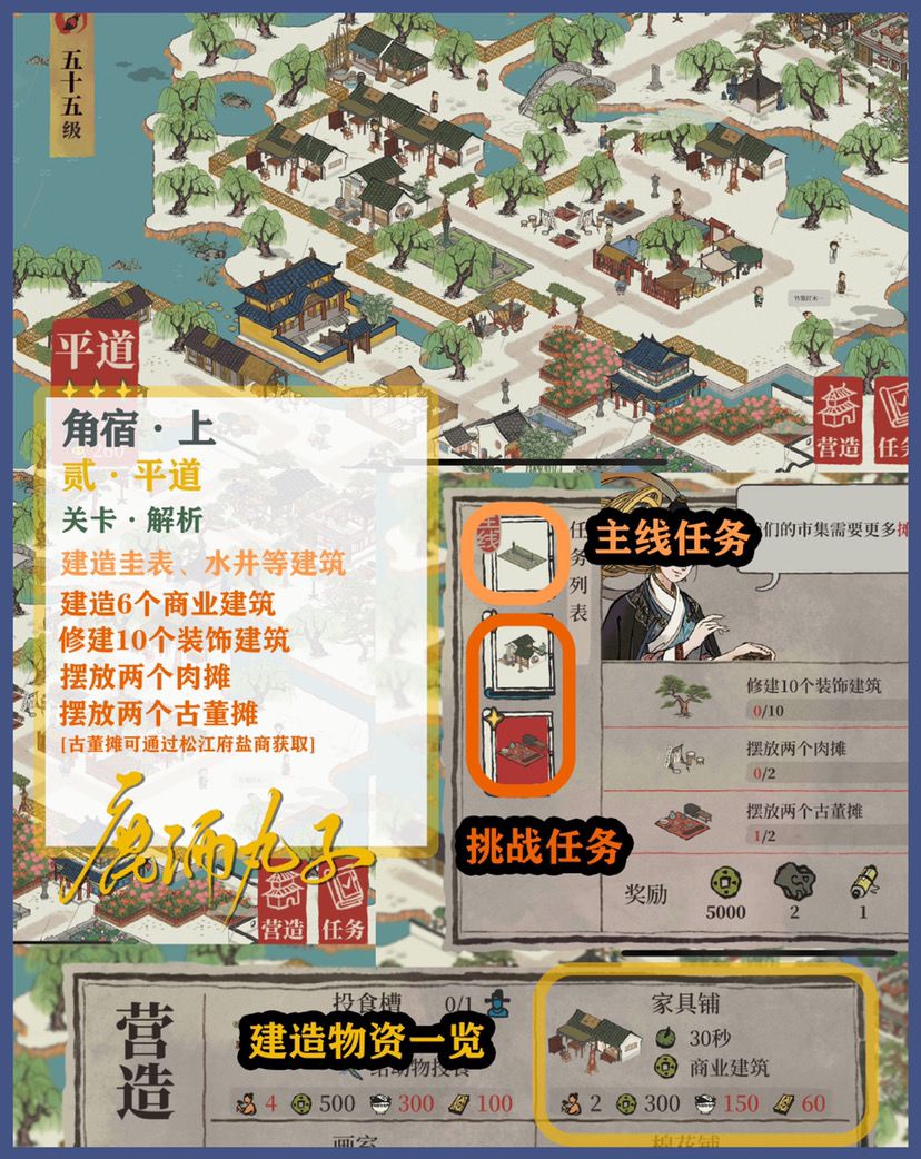 🌿角宿关卡自备建筑:、2个肉摊、2个古董摊、1个凉亭、2个歇脚石、2个休憩桌、2个茶水摊、1个大理石牌坊、2个玩具摊、2个杂物摊、1个打坐石
