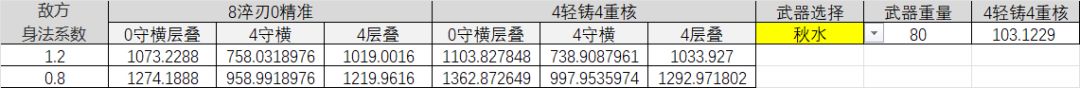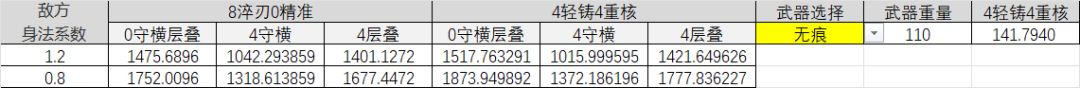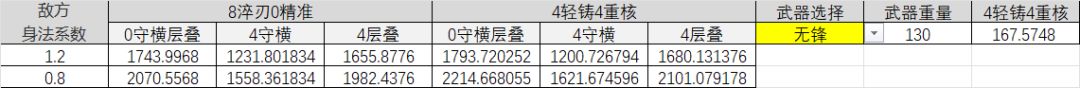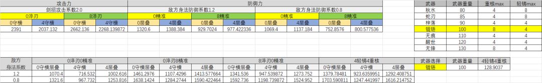 仅仅讨论一个部位的淬刃与轻铸重核影响,这里对每把武器进行分析。由此我们在上述的8淬刃情况下外加4轻铸4重核进行对阵身法系数1.2与对阵身法系数0.8的敌人进行伤害对比(60级武器):