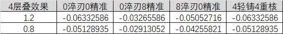 通过上图数据可以发现,在0淬刃0精准情况下,4层叠所带来的伤害降低效果对阵身法系数1.2的对手约为6.33%,对阵身法系数0.8的对手约为5.13%。在8精准的影响下,4层叠效果折效近半(精准的穿透加成对与韧性有较强的限制作用)。