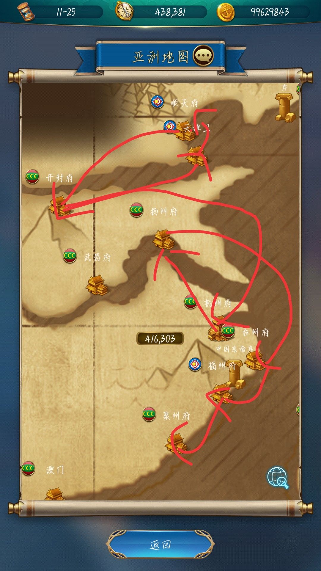 图二是返程路线,到点全买(两条线),到下个港口除了汉阳(攻略里马拉尼要的)需要的货全卖(有特殊货物倾销点最后会说)。最后从开封出来,月份刷新再去一趟顺天,没刷新就直奔辽东半岛然后去汉阳