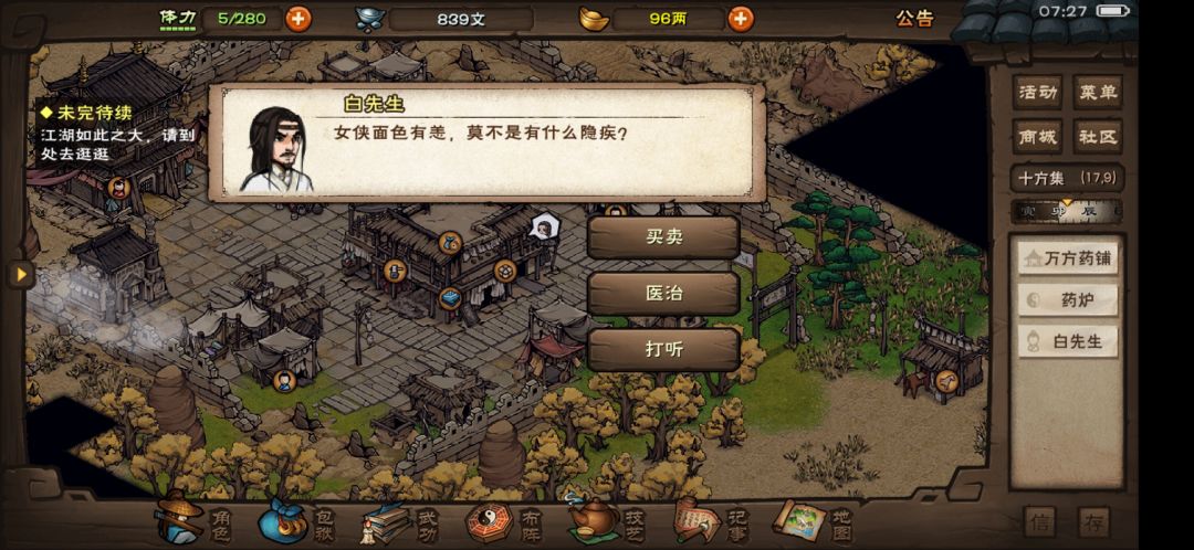 “女侠面色有恙,莫不是有什么隐疾?”万方药铺的白先生在笑一苼一行回到十方集后笑呵呵的迎了出来,张口就是一句万年不变的场面话。笑一苼听了这话,面部马上涨成了猪肝色,心想:我们一行四个人都只剩一口气了,你还提什么gp隐疾,你虾?无奈白先生作为十方集唯一的医生,以后还要有求于他,笑一苼只能把心中的不快憋在心里,淡淡的说:“给我们治疗。”