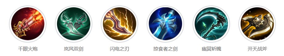 T1:至高裁决、天罚、陨灭、千眼火炮、岚风双剑、闪电之刃、掠食者之剑、幽冥斩魄