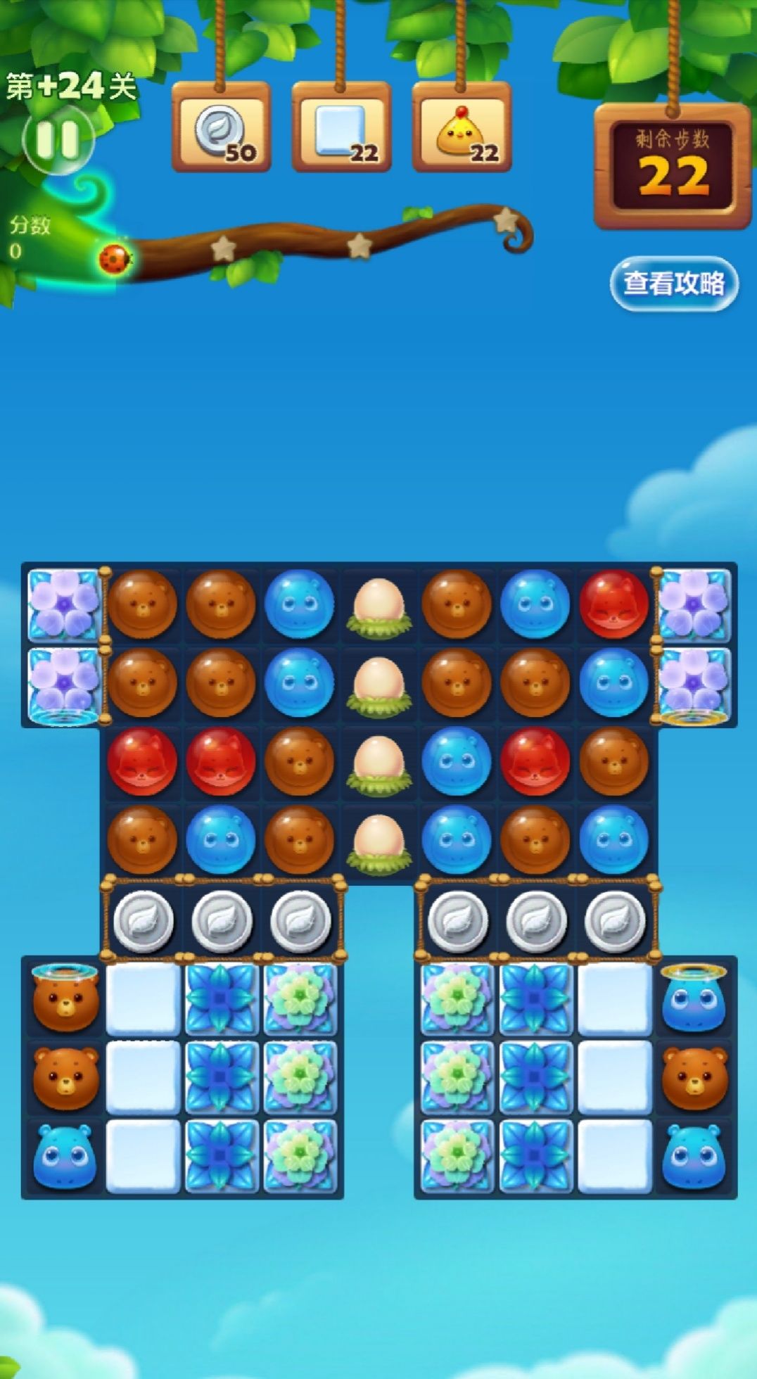 这关没有坑 狂打鸡窝让小黄鸡撒到下面消雪块 消掉下面单层的雪块之后打左右上方两个角的雪块银币就会落下来 多打鸡窝就能过关