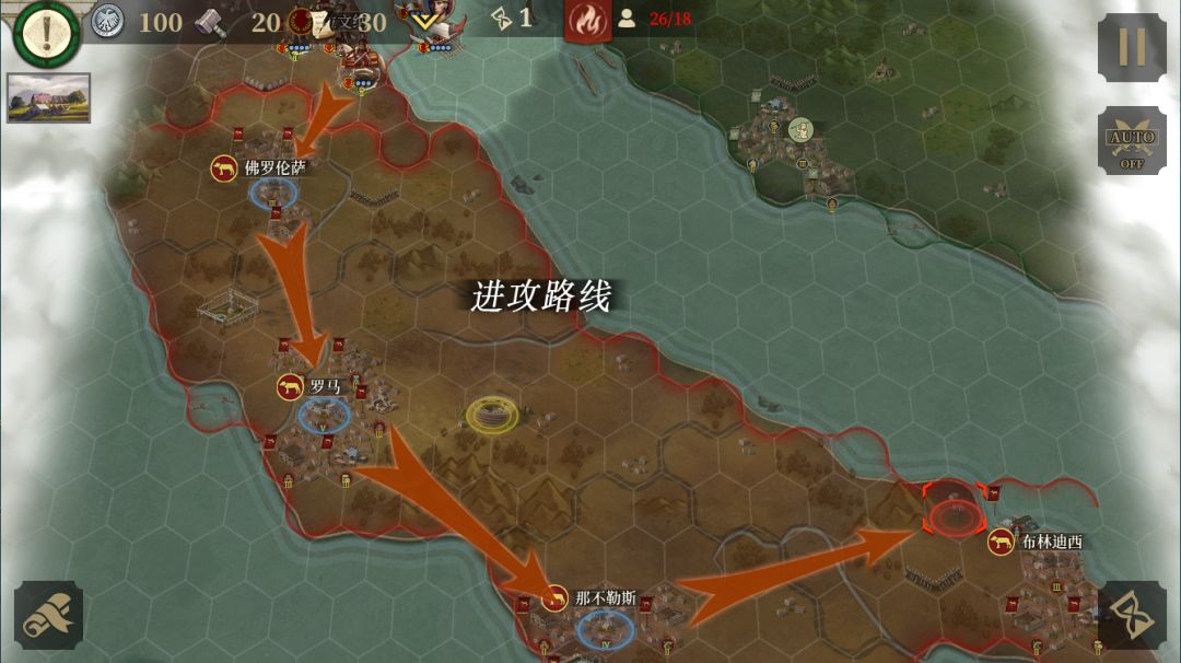 本关的目标是到达集结点,次要目标是人口不低于40、占领3个关键地区。如果你不追求三星,可以直接从海上一口气冲到集结点就过了。三星的话可以按照途中行进路线进攻,过程中占领城市会有不少部队加入我方。注意击败佛罗伦萨守军将领后拉贝利乌斯会叛变。黄圈是海指卷轴一张。