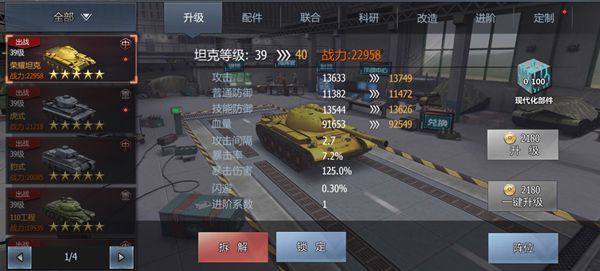 小贴士:坦克部件优先提升升级科研和定制,定制前期固定值属性用处更大,前期一辆火炮刷到红色加普防可以当前排重坦用,后期百分比属性更好。