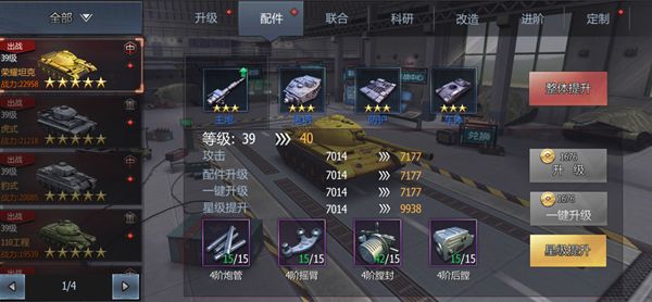 坦克战力提升,坦克等级和配件等级是一方面,前期主要是提升配件星级。