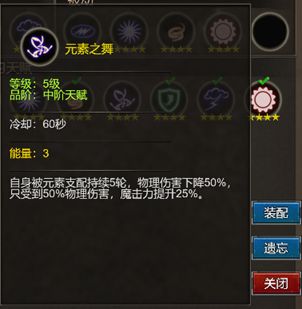 元素之舞:造成物理伤害降低50%,受到的物理伤害降低50%,魔击提升25%,持续5秒