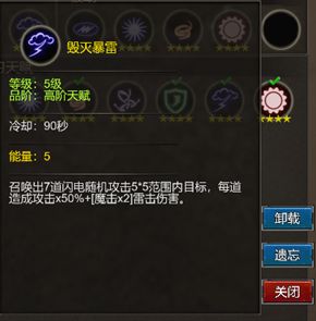 毁灭雷暴:召唤7道闪电随机攻击以自身为中心5 x 5范围内的目标,每道造成高额的雷击伤害