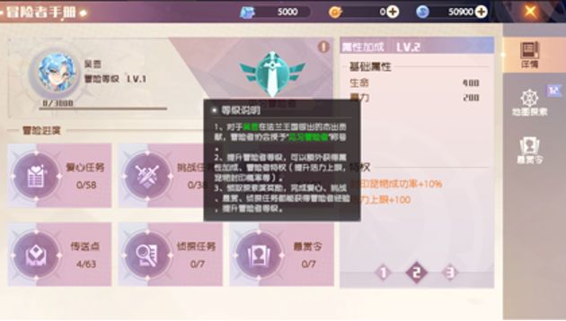 一、首先打开主界面左侧的冒险手册,你会看到下面这个界面,手册记录了我们可以完成的各类地图任务,完成这些任务可以提升我们的冒险等级,获得相应的冒险者称号、额外属性加成和冒险者特权(提升活力上限、宠物封印概率),怎么样,心动了吗?
