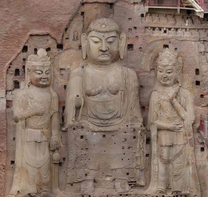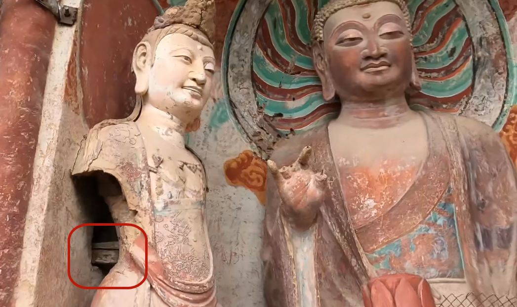 如果注意观察泥像的背后,很多时候都能看到有木柱连接着石窟与塑像,用以固定(图片来自:网络)