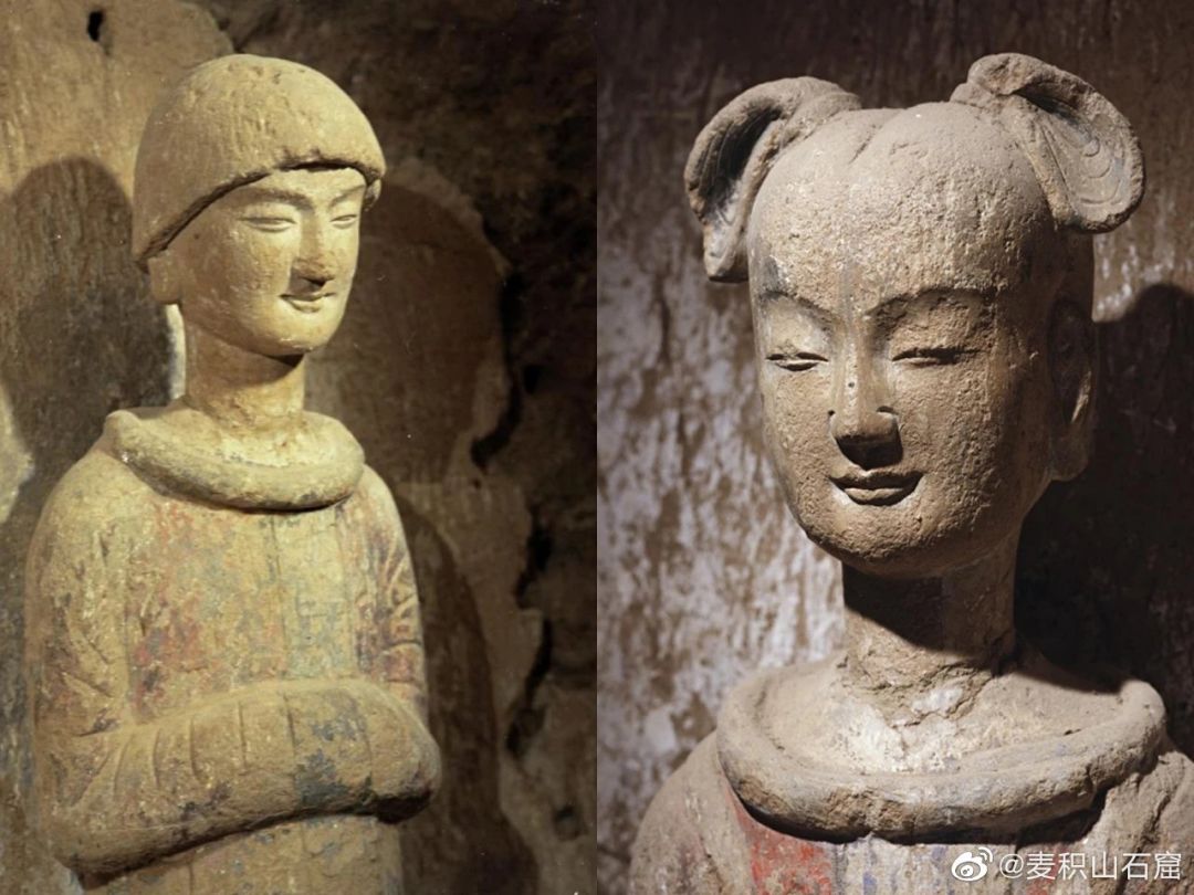 123窟带毡帽的童男和梳牛角辫的童女,造型天真纯朴,生活气息十足(图片来源:麦积山石窟官方微博)