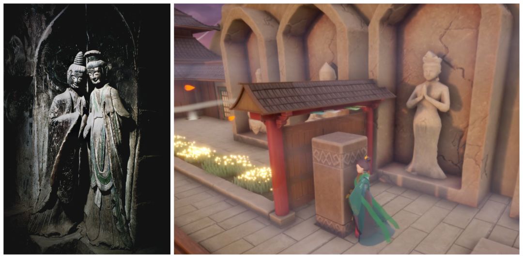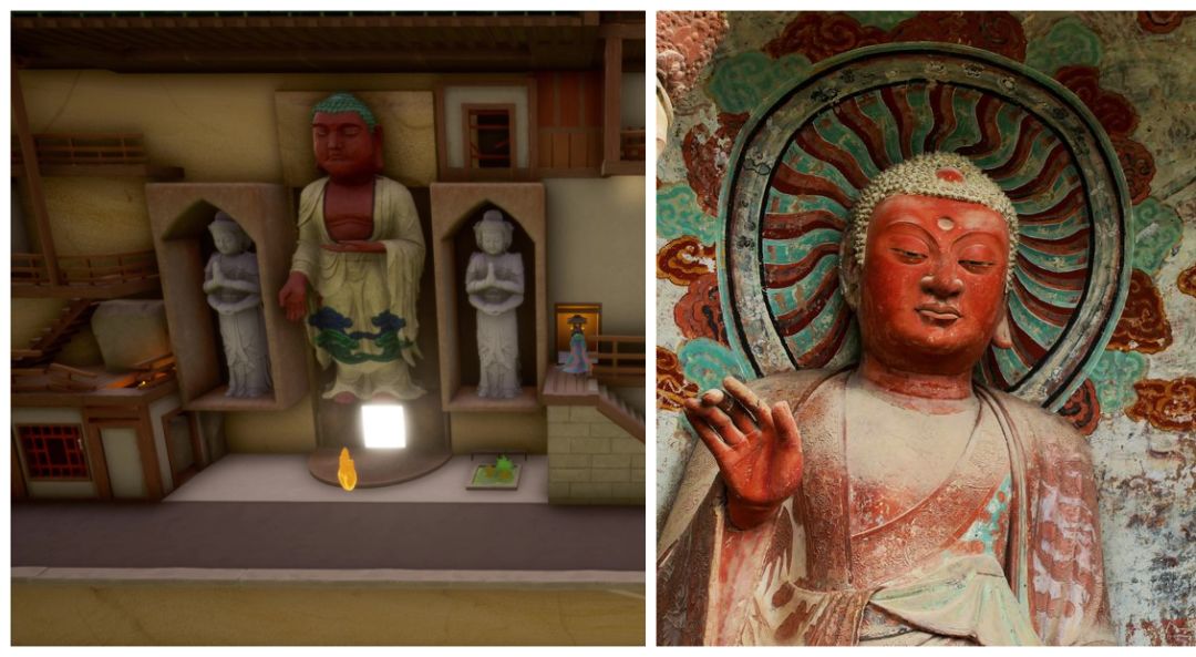 《藏梦》第二章尾段的佛像组取材自麦积山石窟中最大的一组造像——十三号窟东崖大佛(见之前图片)。该佛像组开凿于隋代,距今已有1400多年历史,正中主佛通高15.7米,两侧的胁侍菩萨均高13米。游戏中的佛像设计保留了原佛像的隋代造像风格特征,线条朴实,外形敦厚。