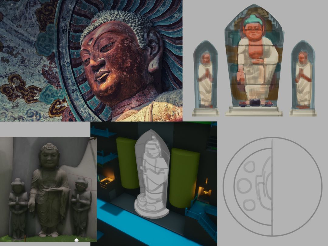 主佛的上色参考的是麦积山石窟第五窟(右图)的主佛像(原画设计:张三千)