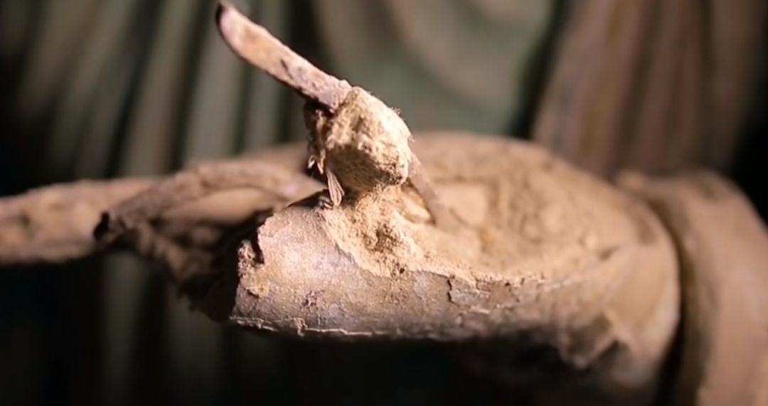 从图片可以隐约看出裹挟在泥土之中的木架与纤维材质(图片来自《麦积山石窟》纪录片)