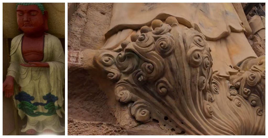 6.细塑形后等泥土风干,最后对塑像进行上彩上色。但麦积山石窟远没这么简单,传统的最终步骤之后,工匠还要细致地给佛像及洞窟描绘装饰及壁画,此后才算大功告成。