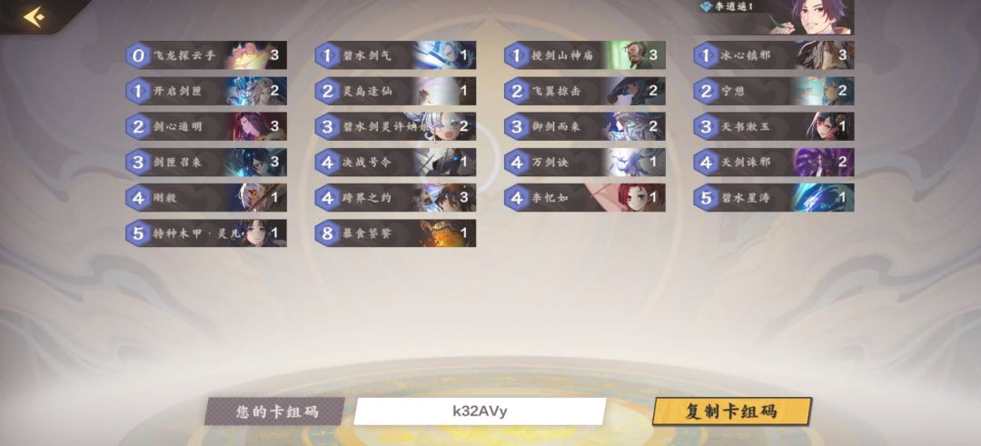两个卡组应对不同天梯环境,可根据顺手程度调整以下卡牌数量:灵岛逢仙,万剑诀,碧水星涛,决战号令,刚毅,飞翼掠击。上手后基本都能做到丝滑斩杀。
