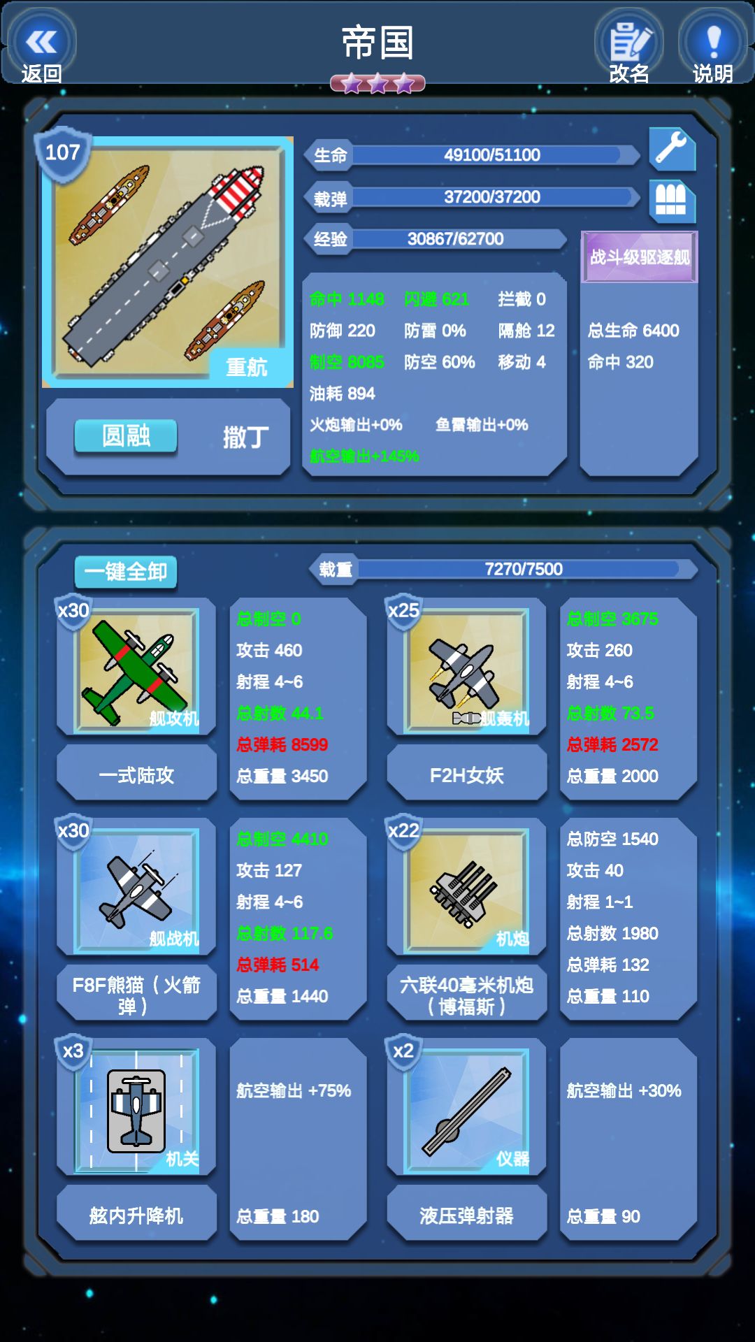 (难得萨丁又有一艘可以用的船),三种舰载机数量均衡,且载重比较充裕(不像加贺装了一式陆攻就装不了其他好的舰载机),装备调整空间较大。图中装备为通用搭配,可将女妖换为景云改,增加制空(作用较小,除非需要堆制空或炸装航时才考虑);机炮选个射数、防空较高的,必要时可以刮大船(现在版本的高炮真恶心,高闪船的快乐都没有了)。