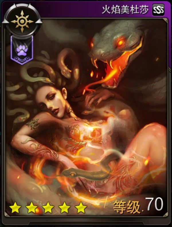 冷艳美人美杜莎,不难猜到她是策略型sss卡牌,她的技能也主要围绕着她的名字火焰的基础上去延伸,主要技能有