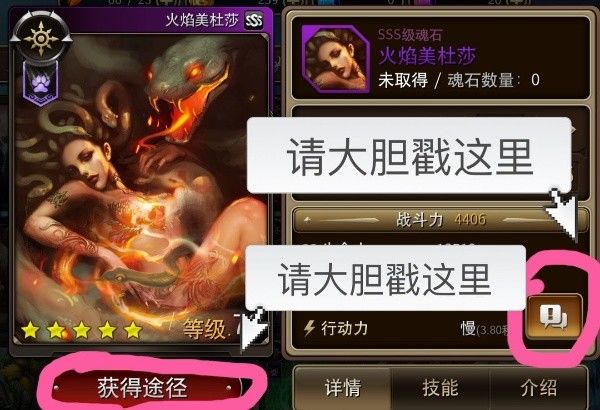 因此,各位喜欢美杜莎女神的冒险家们,可以通过游戏内评论(下图右下角箭头所示位置)以及本帖下的评论,写下对美杜莎女神的青睐,使用格式台词+xxxx(台词内容)的形式参与台词征集。我们从中筛选优质评论录用,并会在万魂论坛中公布选用者在万魂世界中的名号!欢迎大家踊跃参加呀!喜欢她想得到她的冒险家们,可以通过点击下图左下角箭头所示位置获取信息从而得到美杜莎女神的卡牌!
