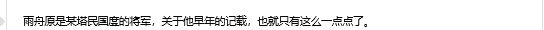 从早期(大概一年前吧)放出的一些游戏的设定资料里来看,雨舟在进入游戏成为商人之前,曾经是大国的将军。