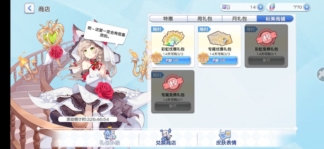 活动的裕美商城,买前两个档的性价比最高,后面属于低于月礼包性价比的补氪抽卡了。