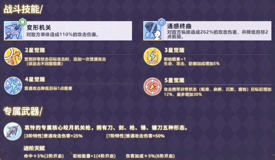 哀怜二星即可当输出使用,获得特殊的觉醒技能,可以对有异常状态角色的攻击进行反击。异常状态的定义如下