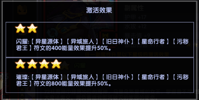 套装效果很朴素,常规的3件套减伤,6件套减少启动要求;400/800能量直观的提高伤害