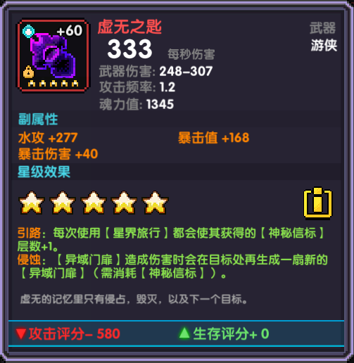 魔女武器,4星效果使得每次紫技能获得的层数增加,每次使用都会增加,叠满后一次位移可以直接获得上限15层buff;5星效果增加橙技能的持续输出能力是非常核心的词条