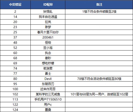获奖说明:以上中奖玩家均符合活动参与规则,部分抽中楼层因不符合活动条件奖励则顺延一层楼,若顺延楼层也不符合活动要求则顺延至符合要求楼层,同一ID则只获取一次奖品