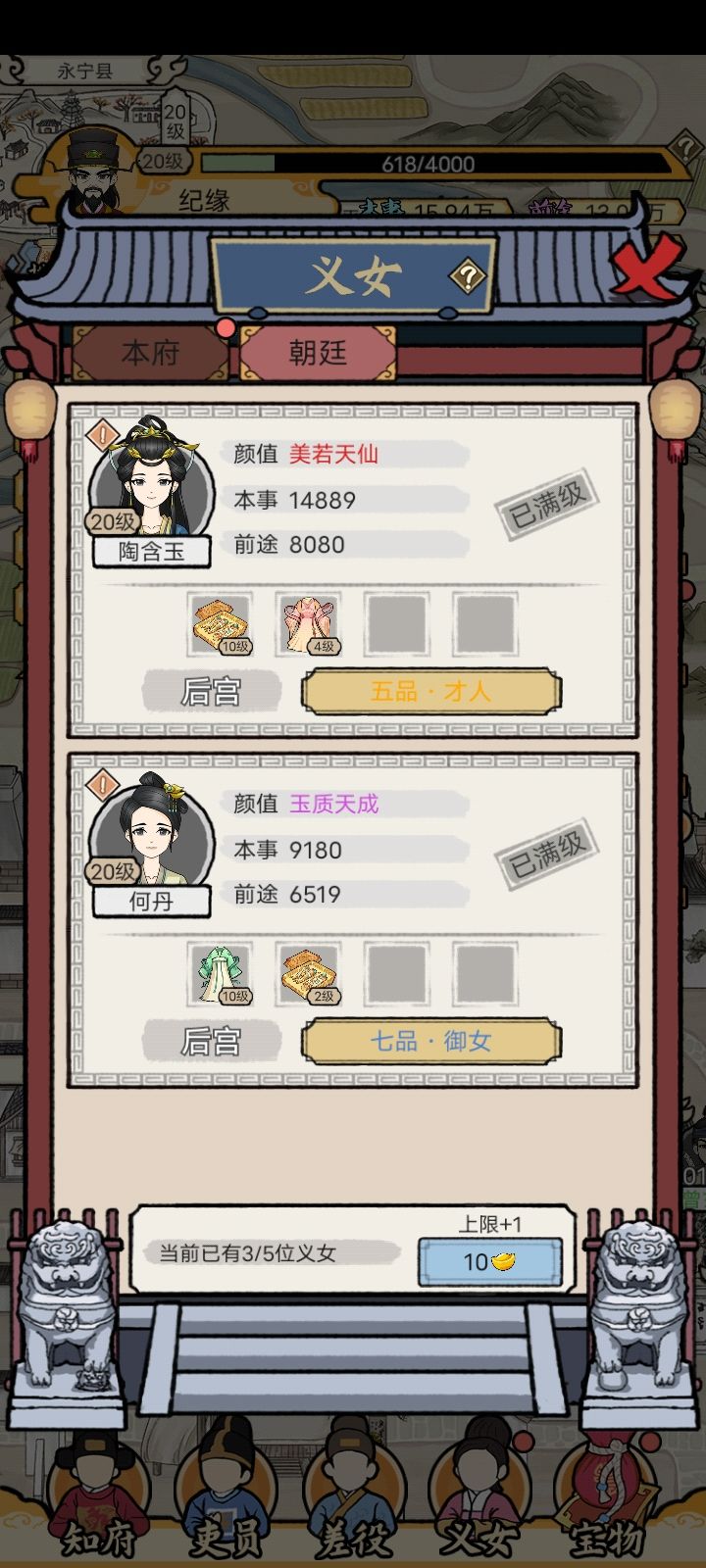 培养没啥用,全靠宝物,建议加强培养数值,和银子金子获取渠道,和玩法,最重要的是,能给在朝廷的官员换宝物!(很重要)