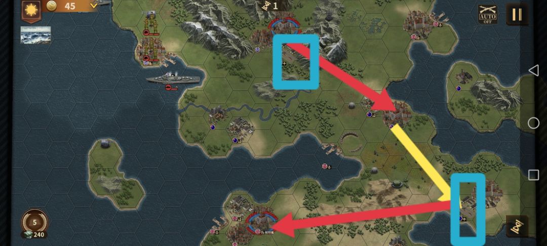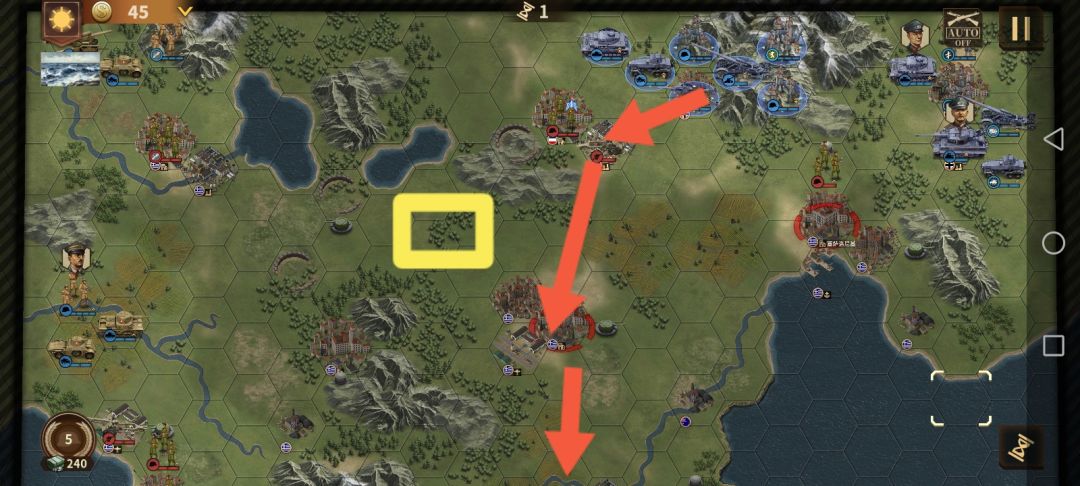 首先,先讲讲大概思路,进攻路线为红线,黄线也是进攻路线,要注意的是派个步兵去占机场就好了(最好为伞兵)而黄圈是一个有4编步兵的将,虽然说脚下有个黄圈但打了感觉就触发了剧情(对你的进攻好像没啥太大帮助,注意一下就好)