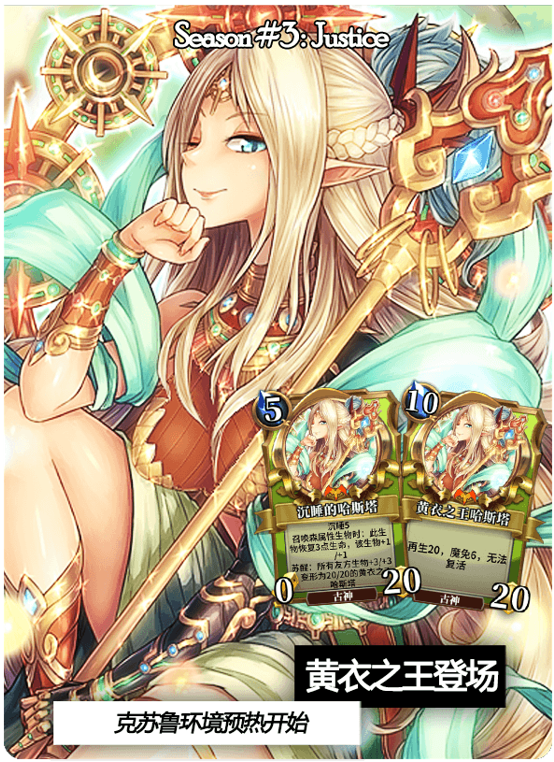 2、新增克苏鲁预热卡牌“沉睡的哈斯塔”,具体效果如下:(沉睡5,召唤森属性生物时:此生物恢复3点生命,该生物+1/+1,苏醒:所有友方生物+3/+3,变形为20/20的黄衣之王哈斯塔)