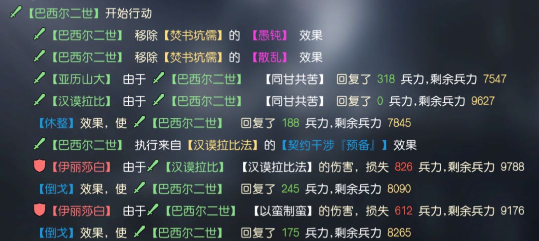 如该阵容中,巴西尔二世利用以蛮制蛮伤害技能效果,能在汉谟拉比法、马其顿祝福等技能的伤害下触发伤害,以此联动狂怒的倒戈恢复兵力,再触发同甘共苦的队伍恢复,将巴西尔二世的兵种更换为马穆鲁克后,将保证每回合必定触发1次全体治疗(休整40%,同甘共苦35%)。极大的提高了原有阵容的续航能力与容错率。