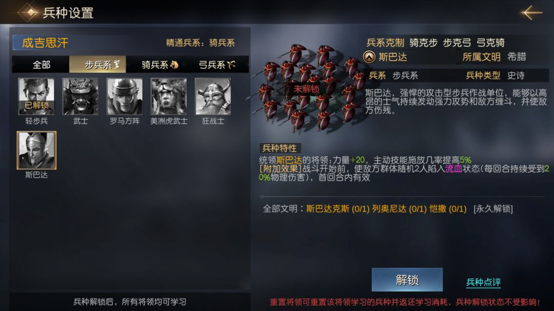 斯巴达为步兵系兵种,擅长高额爆发,能为将领提供20点力量加成,并提升5%的主动技能释放率。只要队伍中有将领携带此兵种,就能在开局第一回合对敌方2人施加流血。