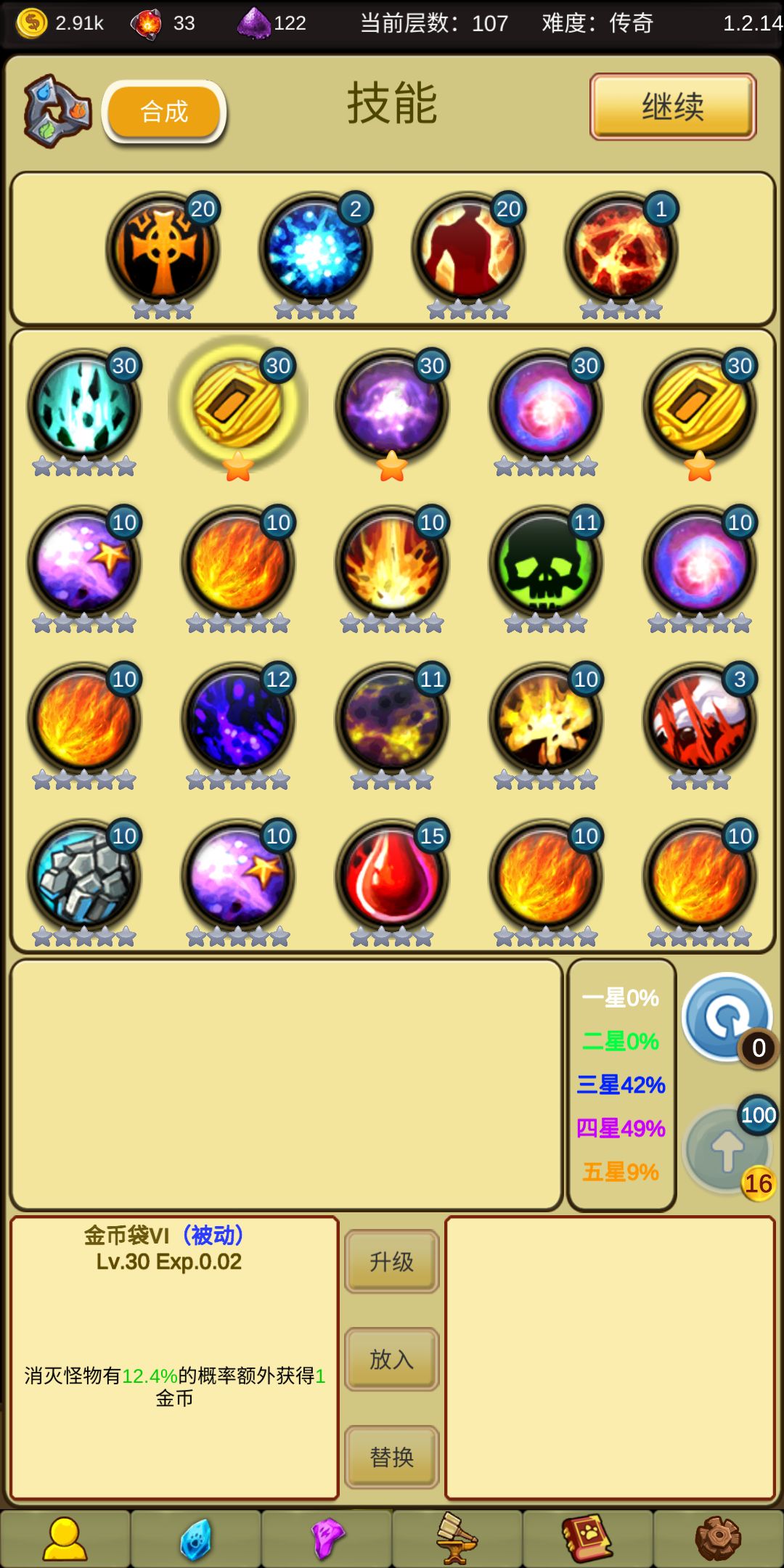 两个30级金币加成,加地爆冲击前面几层有训练室的话基本可以刷两百金币左右,普通关卡也有50金币。这样前期可以什么技能都不用买,直接可以10层内升满技能刷新等级。然后再刷五星技能替换。