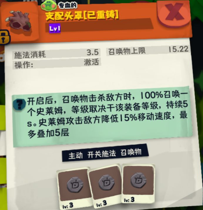 2.1头盔=支配头盔(第二附魔):杀死敌人100%召唤史莱姆。可以起到T的作用,前边扛着,防治怪跑过来,后边放召唤法阵,自爆召唤物使劲冲刺,爆炸。