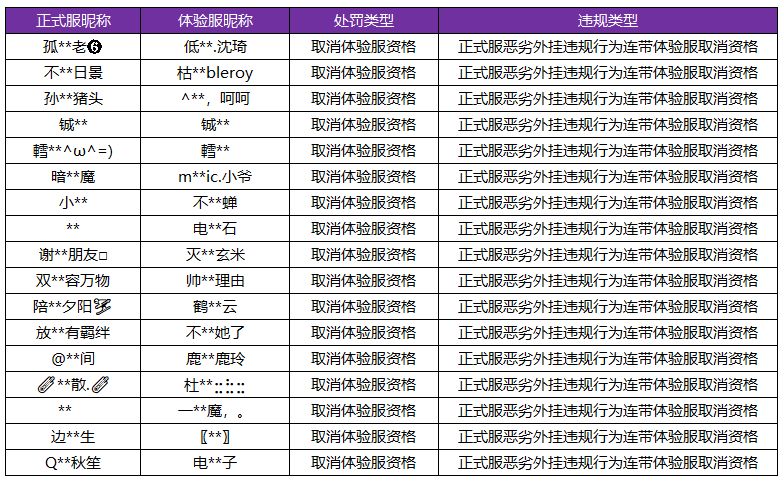 附注:7月28日正式服恶劣外挂违规连带体验服剔除资格账号名单
