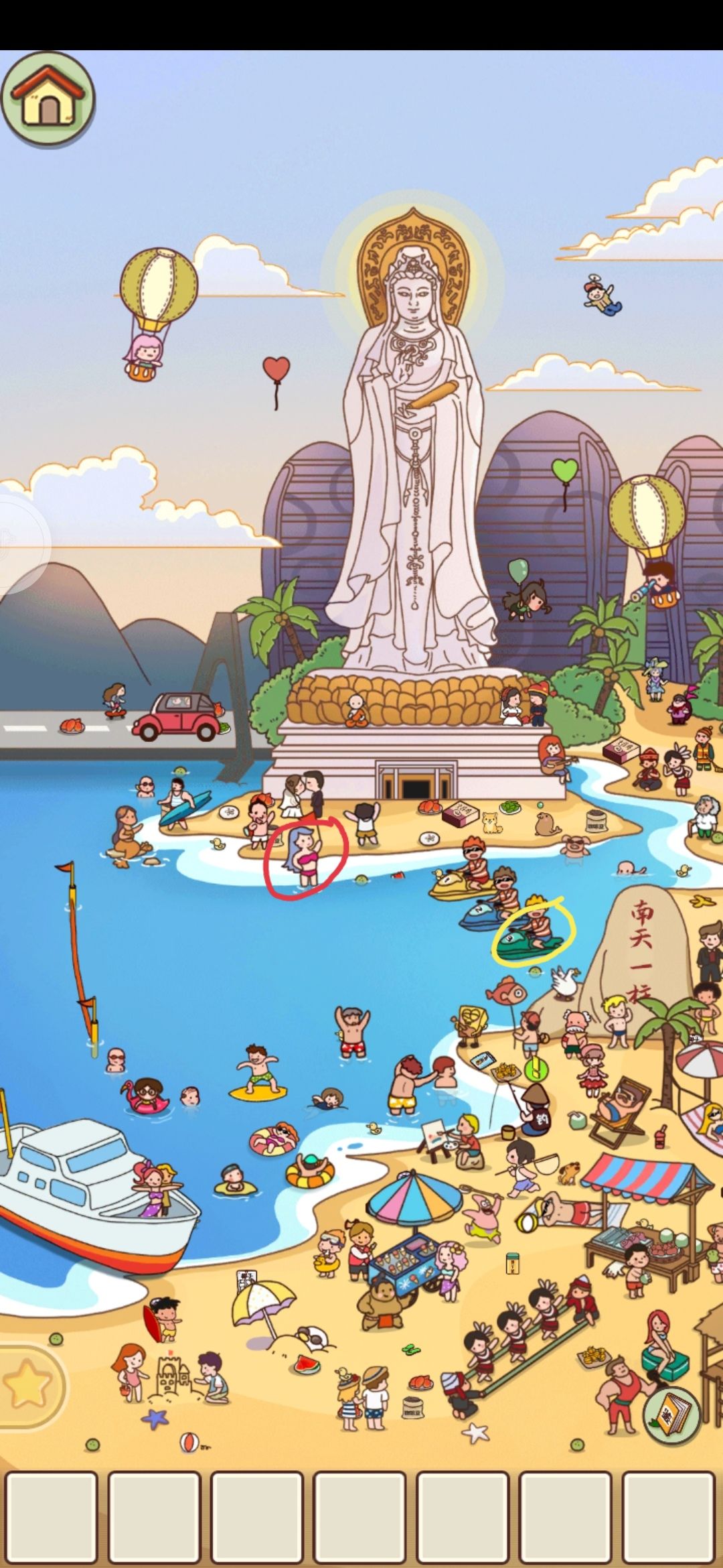 点击图中红圈内小男孩触发,沙滩鞋在图中蓝圈位置