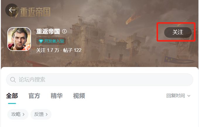 进入【重返帝国】——>点击右侧【+关注】即可成功关注