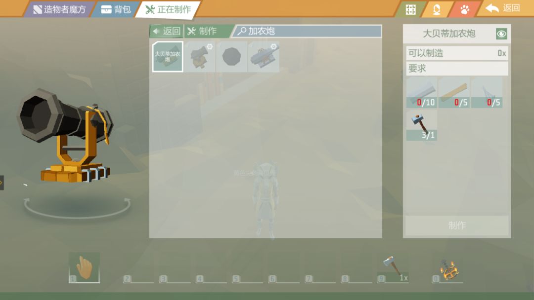 想要制作加农炮,首先要打开“制作面板”,搜索加农炮。这时候你会发现加农炮还有其他种类,但我们本期主要向大家分享的是大贝蒂加农炮的制作方法。
