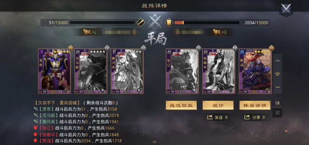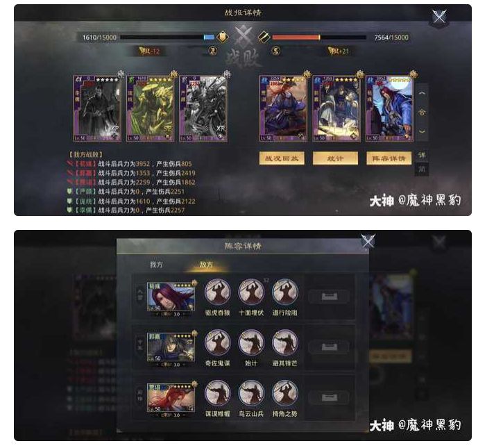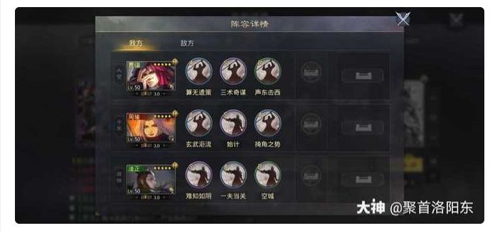 临兵列阵也能组出【魏之智】,想不到吧?大营大狗【十面埋伏】+【道行险阻】双输出;中军大郭嘉【始计】有洞察效果,【避其锋芒】提供减伤;前锋魏贾诩【鸟云山兵】为队伍提供一个后期减伤,这个战法与【避其锋芒】除前3回合外,减伤效果并不冲突,这里携带一个【掎角之势】也是为了契合主战法佩戴的一个主动战法。虽然我没拿到,但是我感受到对手很强!