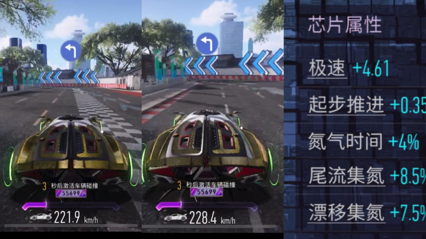 左边啥芯片也没带,右边芯片装满,芯片效果就是最右边的