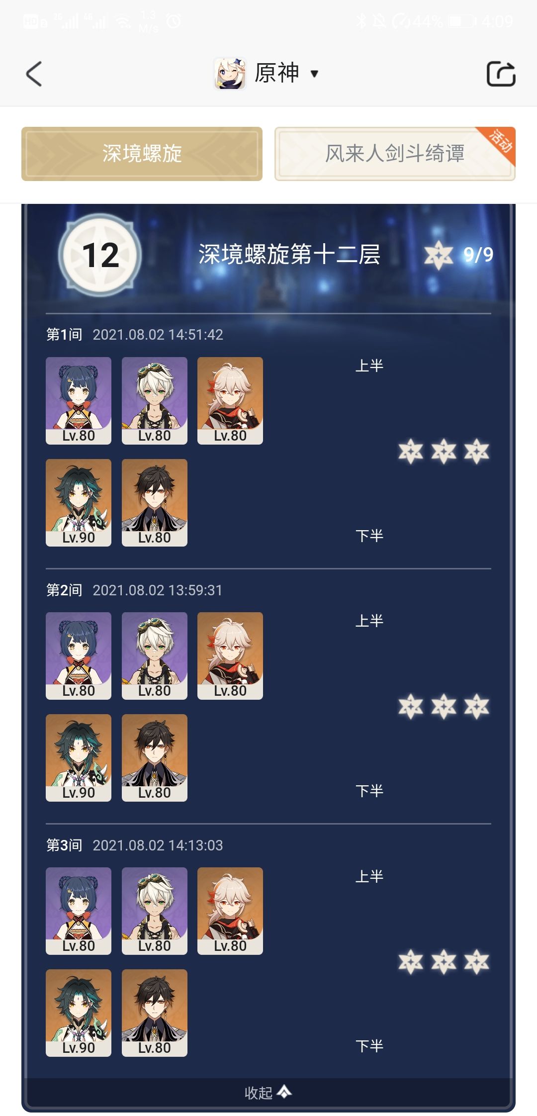 上半:满命天空枪香菱+满命风鹰剑班尼特+0命铁峰剑万叶