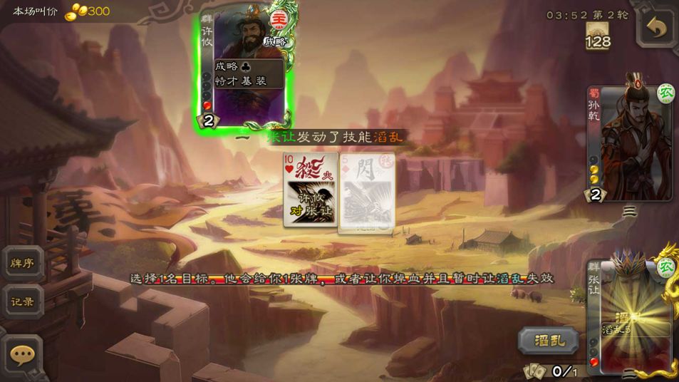 3,所有滔乱的牌本局游戏只能使用一次,这也奠定了张让是一个爆发将,续航能力欠佳,越拖越弱。
