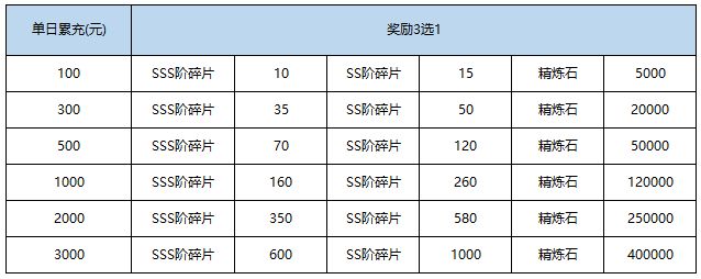 在活动期间, 游戏单日累充达到指定金额,即可在3个奖励中任选其一。指挥官可在本帖下回复区服+角色名称以及需要的奖励内容(SSS阶碎片/SS阶碎片/精炼石),我们会统计您在活动期间的充值, 为您发放活动奖励。您也可以加入前方高能Q群(具体方式请查看游戏内邮件),将您的个人信息以及奖励内容反馈至群管理,以便我们发放活动奖励!