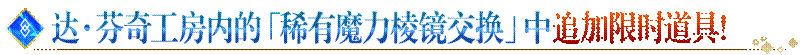 达·芬奇工房内的「稀有魔力棱镜交换」中将限时追加以下道具。 ◆道具兑换时间◆2021年8月5日(周四)维护后~8月19日(周四)13:59为止 ◆追加道具◆
