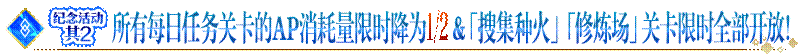 迦勒底之门中出现的所有每日任务关卡的AP消耗量限时降为1/2!(即使在战斗中撤退,AP消耗量也会降为1/2) 此外,迦勒底之门中每日替换的「搜集种火」和「修炼场」关卡将全部开放。 ◆活动时间◆2021年8月5日(周四)维护后~8月12日(周四)23:59为止 ◆对象关卡◆l 搜集种火【5周年纪念】搜集种火<枪·杀篇>初级、中级、上级、超级【5周年纪念】搜集种火<剑·骑篇>初级、中级、上级、超级【5周年纪念】搜集种火<弓·术篇>初级、中级、上级、超级【5周年纪念】搜集种火<随机篇>初级、中级、上级、超级 l 修炼场【5周年纪念】弓之修炼场 初级、中级、上级、超级【5周年纪念】枪之修炼场 初级、中级、上级、超级【5周年纪念】狂之修炼场 初级、中级、上级、超级【5周年纪念】骑之修炼场 初级、中级、上级、超级【5周年纪念】术之修炼场 初级、中级、上级、超级【5周年纪念】杀之修炼场 初级、中级、上级、超级【5周年纪念】剑之修炼场 初级、中级、上级、超级 ※限时出现的「搜集种火」和「修炼场」关卡与平时的「搜集种火」和「修炼场」关卡不同,所以无法继承「关卡情报」,敬请注意。