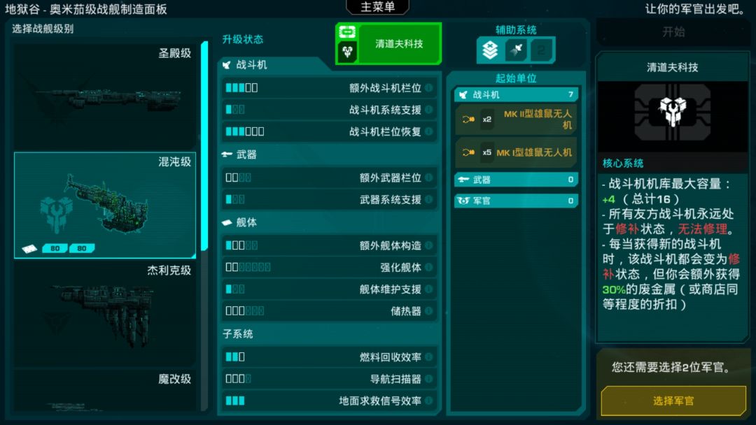 混沌级:优势是战斗机多,战斗机回复快,配合雄鼠战斗机被动,能打出不错效果。以及不太缺钱,科技可以减价,拆取废金属。还有就是不用担心战斗机的损坏(因为没法修)第三,地面求救满。一节乱杀